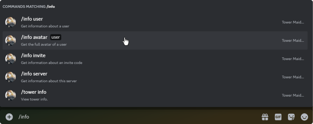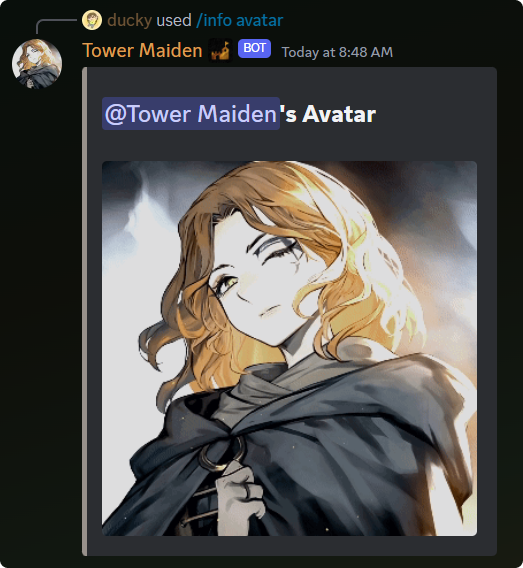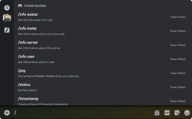 Once the command processes, Tower Maiden should respond to you in the same channel you ran the command in.