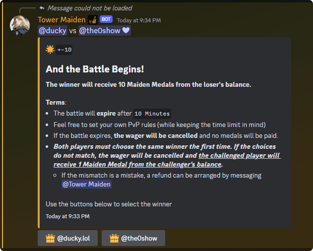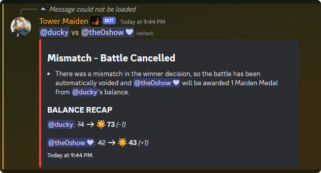 A mismatched winner decision; the challenged player receives one Maiden Medal from the challenger